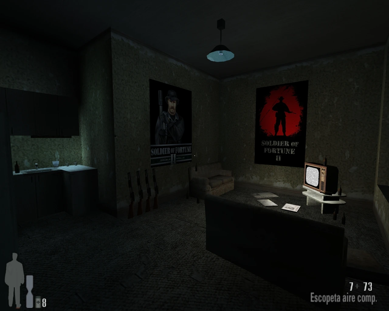 Rompe la última ventana de ese lado para entrar en un cuarto secreto con pósters del juego Soldier of Fortune II y varias Escopetas.